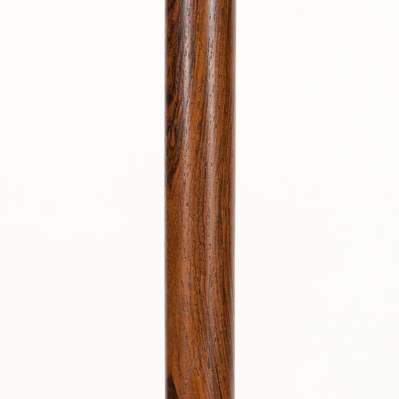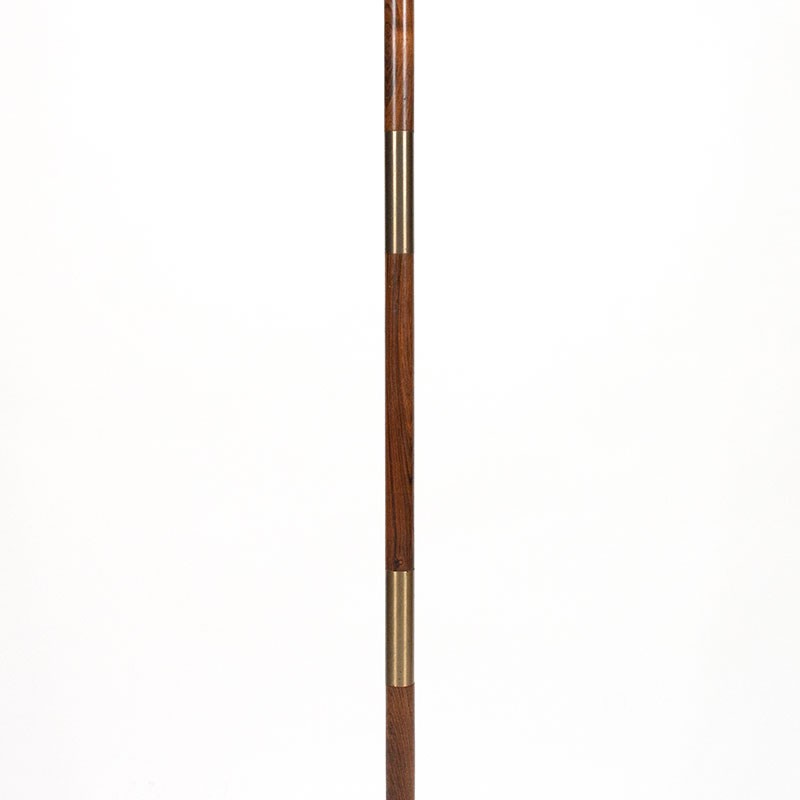 Danish Mid-Century floor lamp by designer Jo Hammerborg. Beautifully designed base in brass and rosewood; the shade has been replaced with a new one. The condition is reasonably good, some spots are visible on the brass base, and the wiring has been replaced. The dimensions are 163 cm high and 40 cm in diameter (shade).
