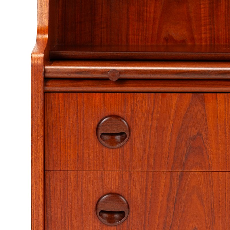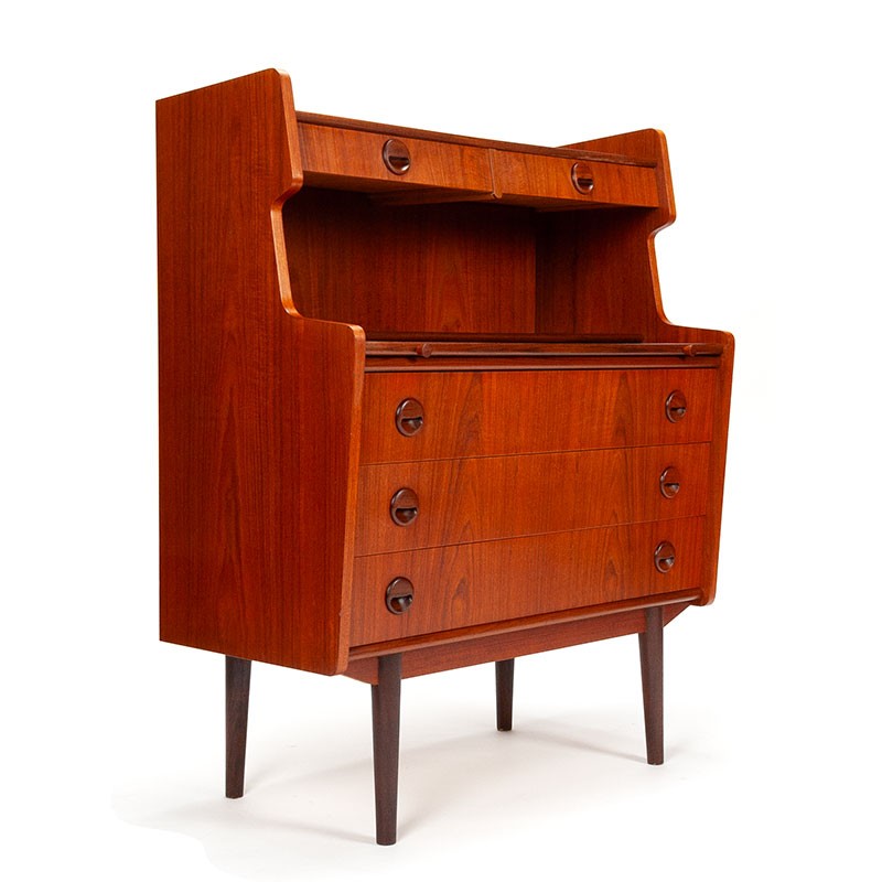 Teak vintage designer desk from Denmark, period 1960-1969. Beautiful stylish model with a pull-out worktop and plenty of storage space in the small and large drawers. Also see the beautiful wood drawing that continues at the front of the drawers. The condition is good, only very minimal traces of use, see details. The dimensions are 89.5 cm wide, 45 cm deep and 111 cm high, worktop present at a height of 73 cm.