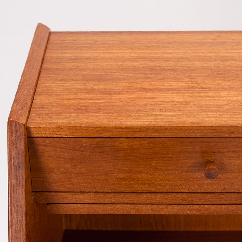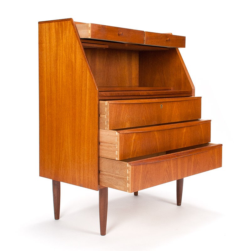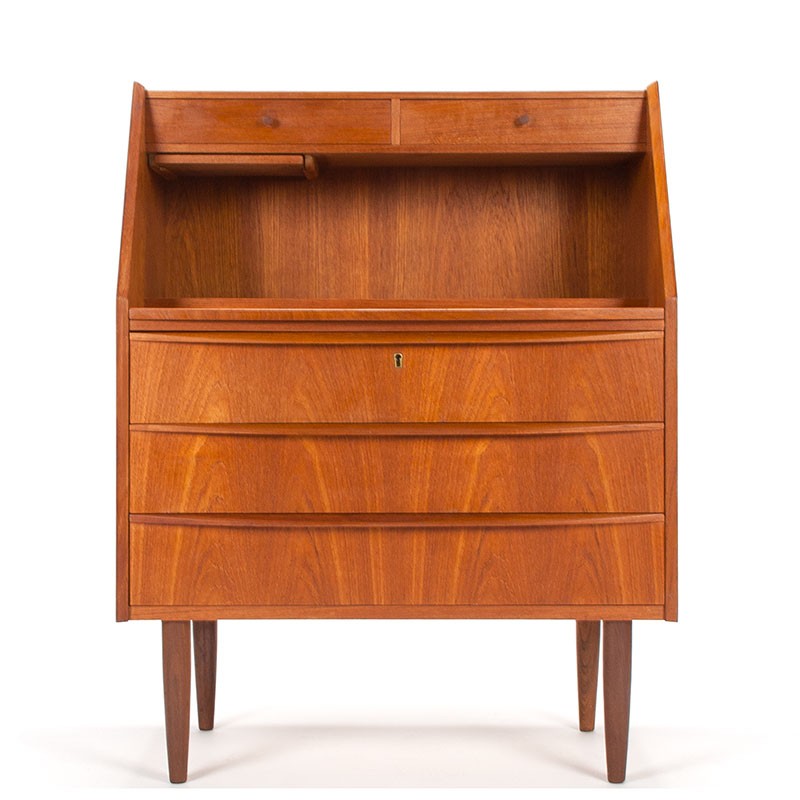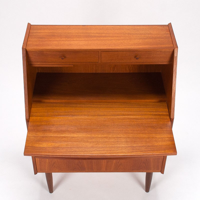 Mid-Century Danish vintage secretary. The secretary has a beautiful sleek design, three spacious drawers at the bottom, 2 small drawers and a hidden mirror. The extendable worktop is present at 69 cm. The condition is good, only minimal traces of use appropriate to the age, see details. The dimensions are 79.5 cm wide, 42 cm deep and 104 cm high.