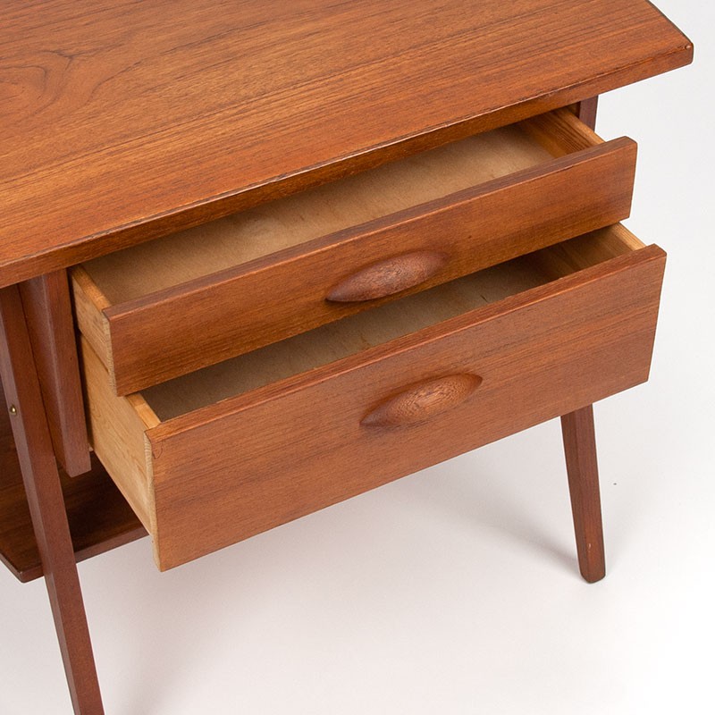Mid-Century small Danish cabinet with 2 drawers from the period 1960-1969. Beautiful model with slanted legs. The condition is reasonable, there is a water ring visible on the top with certain light, see details (price has been adjusted). The dimensions are 64.5 cm wide, 44.5 cm deep and 55.5 cm high.