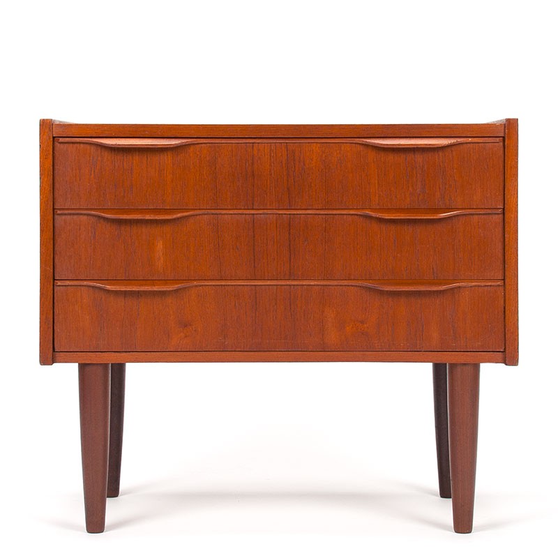 Danish chest of drawers with 3 drawers, from the sixties. Beautiful vintage model with organically shaped handles. The condition is good considering the age, see details. The dimensions are 60 cm wide, 29.5 cm deep and 53 cm high.