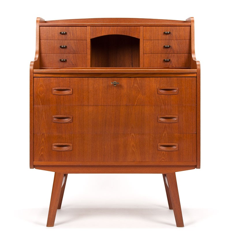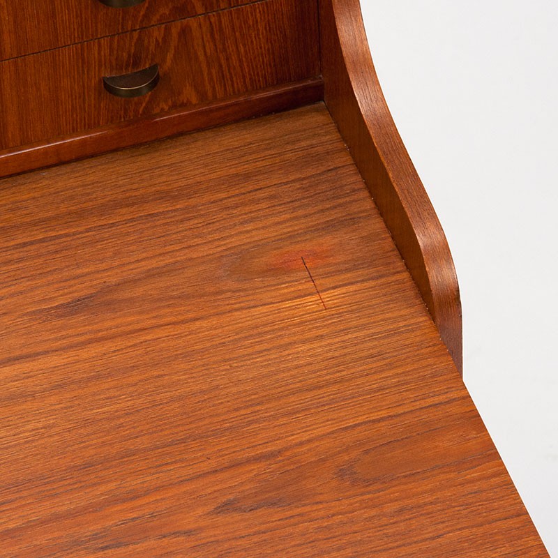 Vintage secretary from the fifties, Denmark. Model with a pull-out worktop, and various large and small drawers. Nice detail are the brass handles on the small drawers and the slanted legs. The condition is good, minimal traces of use, see details. The dimensions are 80 cm wide, 43 cm deep and 104.5 cm high.