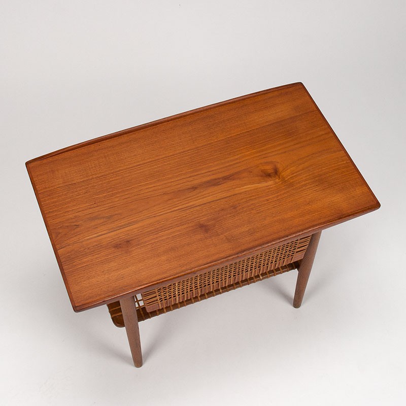 Danish cabinet/side table from the period 1960-1969. Stylish vintage model with special design and materials. Large drawer with separate compartment, the drawer is covered with woven wicker at the front and back. The top has a raised edge. The condition is good, the wicker is completely intact, see details. The dimensions are 75.5 cm long, 44.5 cm deep and 56 cm high.