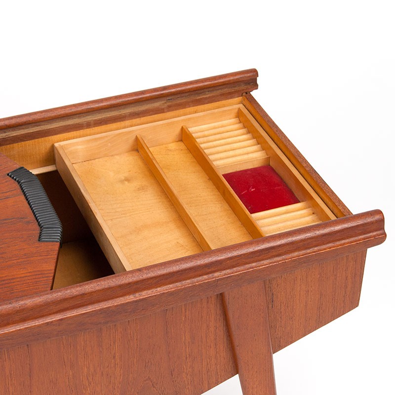 Danish sewing table from the late 1950s. Beautiful vintage model on slightly slanted legs. The top slides open, revealing a separate compartment and an open space. It's in good condition, with only minor signs of wear; see details. The dimensions are 76 cm long, 35.5 cm wide, and 52.5 cm high.