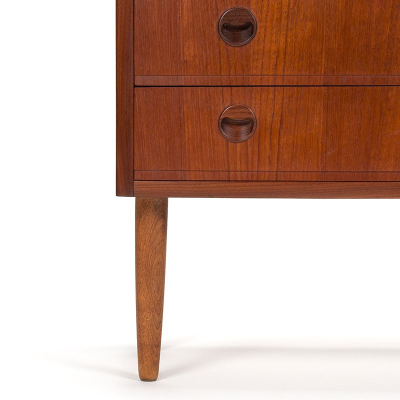 Danish chest of drawers with 5 drawers (two smaller drawers on top). The chest is made of teak and has a beautiful design, with a slightly curved front. The design is derived from Kai Kristiansen. It is in good condition, with minimal signs of wear consistent with its age; see details. The dimensions are 70 cm wide, 33.5 cm deep, and 74 cm high.