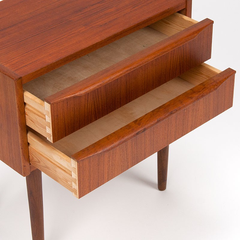 Stylish Danish Mid-Century modern vintage chest of drawers. This small model stands on tall, slender legs and features two drawers. The drawers have beautifully designed handles. The condition is good, with only very minimal signs of wear; see details. The dimensions are 48.5 cm wide, 28.5 cm deep, and 52.5 cm high.