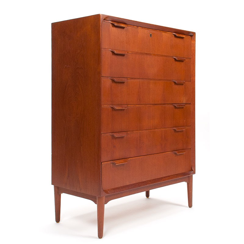 High-quality Mid-Century Danish chest of drawers. This vintage chest of drawers has six drawers and is crafted from teak with beautiful handles. The design is attributed to Johannes Andersen. The unique curves on the corners are noteworthy. The condition is good, with only very minimal signs of wear; see details. The dimensions are 84.5 cm wide, 42 cm deep, and 118 cm high.