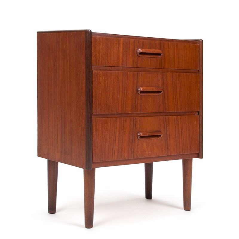 Small chest of drawers from 1960-1969, Denmark. Beautiful model with three drawers, made of teak. A nice detail is the continuous wood grain on the front. The condition is good considering its age; see details. The dimensions are 50 cm wide, 27.5 cm deep, and 61 cm high.