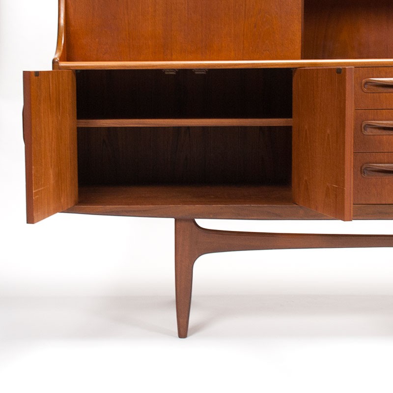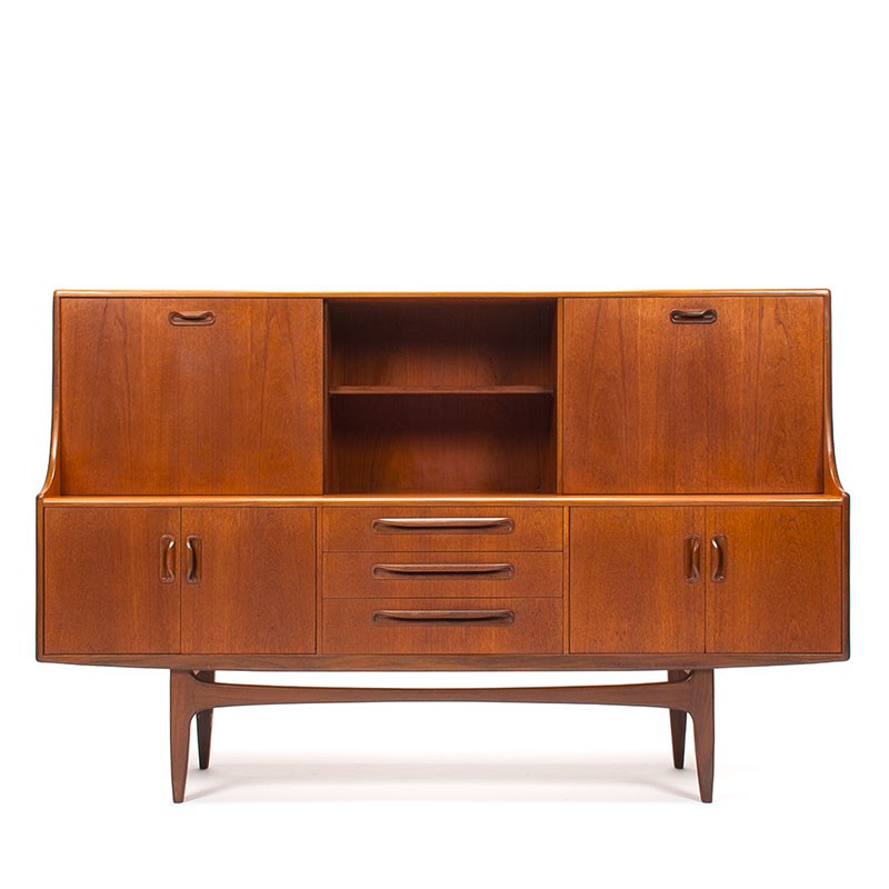 Mid-Century English design large sideboard from the 1960s. This mid-height sideboard is part of the Fresco series designed by Victor Wilkins for Gplan. This beautiful, solid vintage highboard offers ample storage space on an open base. Its condition is good considering its age, with minimal signs of wear, except for a scratch on the left side (see details). The dimensions are 188 cm long, 46 cm deep, and 122 cm high.