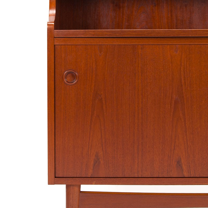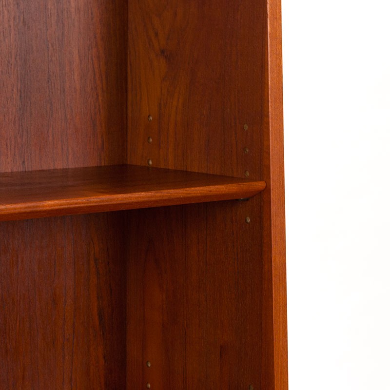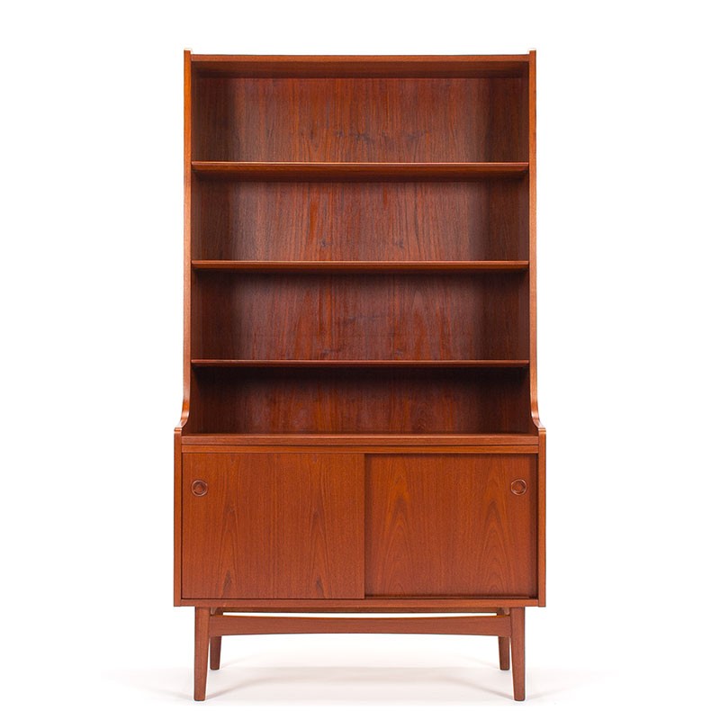 Bookcase from the 1960s, made in teak. This Mid-Century bookcase was designed by Johannes Sorth and manufactured at Nexø Møbelfabrik Bornholm. It's a beautiful, spacious bookcase with adjustable shelves and sliding doors underneath. It's in good condition, with only minimal signs of wear; see details. The dimensions are 100.5 cm wide, 42.5 cm deep, and 182 cm high.