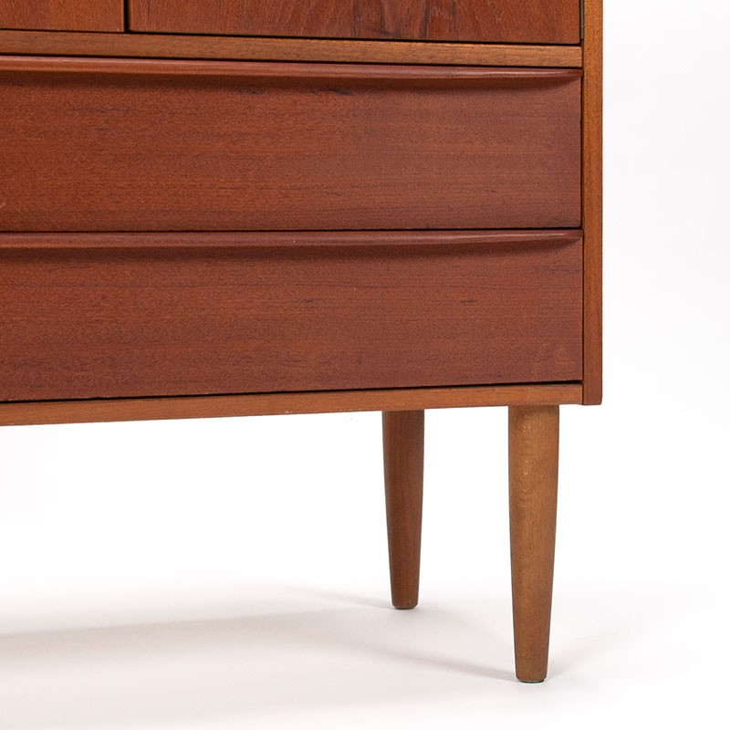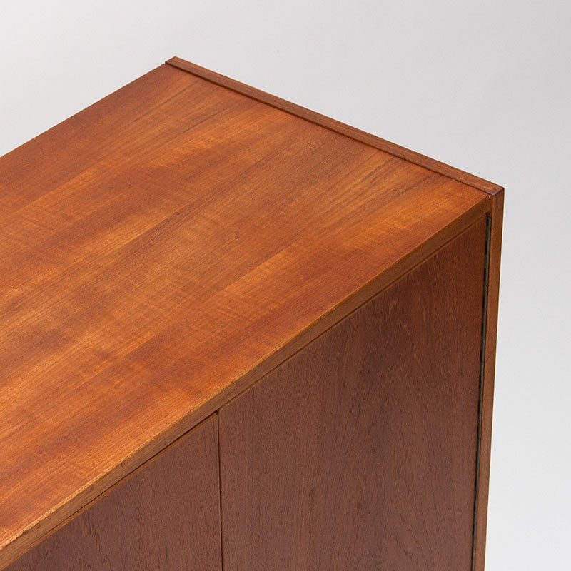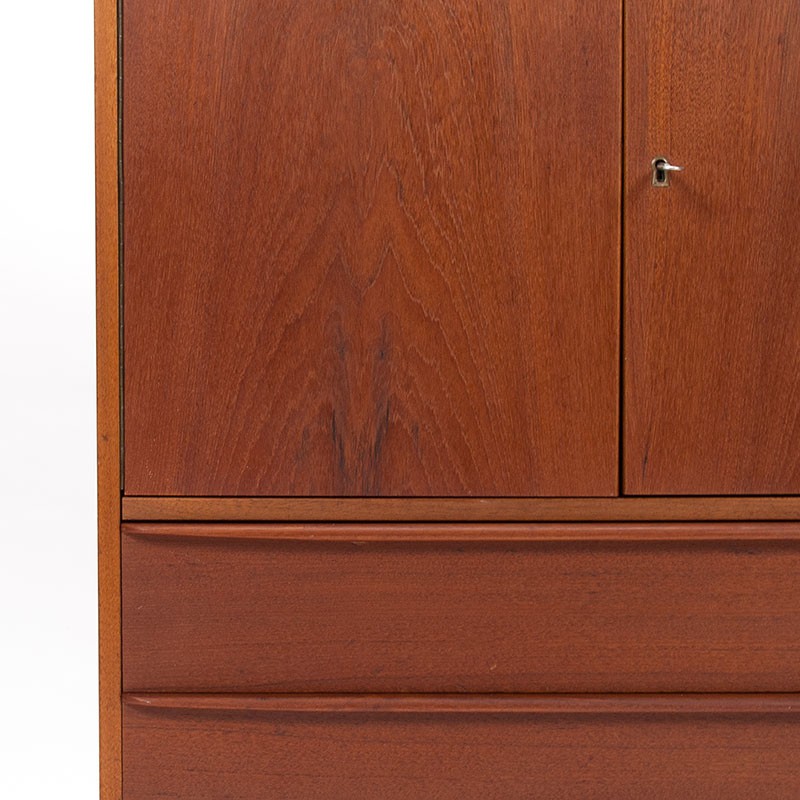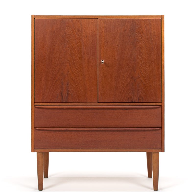 Vintage Danish cabinet from 1965-1969. This nice model features two hinged doors on top and two drawers on the bottom, providing ample storage space. The condition is good, with only minimal signs of wear consistent with its age. The dimensions are 77.5 cm wide, 39.5 cm deep, and 104 cm high.