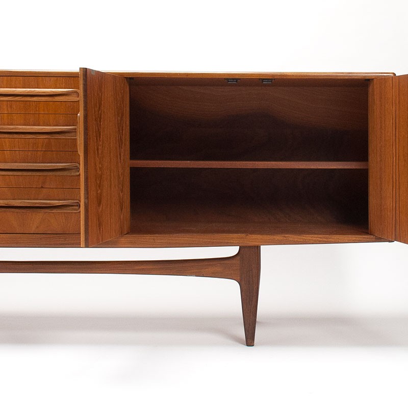 Large Mid-Century Modern design sideboard from the 1960s. This vintage sideboard was designed by Victor Wilkins as part of the Fresco series for the English furniture manufacturer Gplan. It features a beautifully symmetrical design with a central drawer unit and hinged doors on either side, all on an open base. It is in good condition, with only very minimal signs of wear; see details. The dimensions are 213.5 cm long, 45.5 cm deep, and 79.5 cm high.