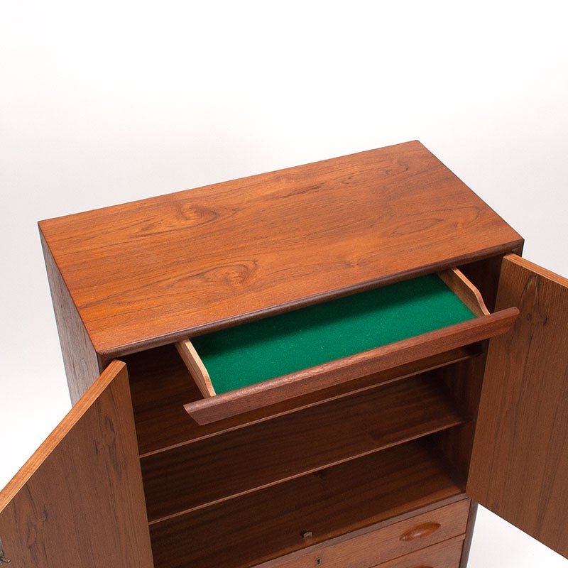 Danish cabinet from the period 1960-1969, most probably by Harald Nielsen. This vintage cabinet is made of teak and has two hinged doors, with shelves and a cutlery drawer behind them. The bottom of the cabinet contains two spacious drawers. The condition is good considering its age; no rings, see details. The dimensions are 75 cm wide, 38.5 cm deep, and 115 cm high.
