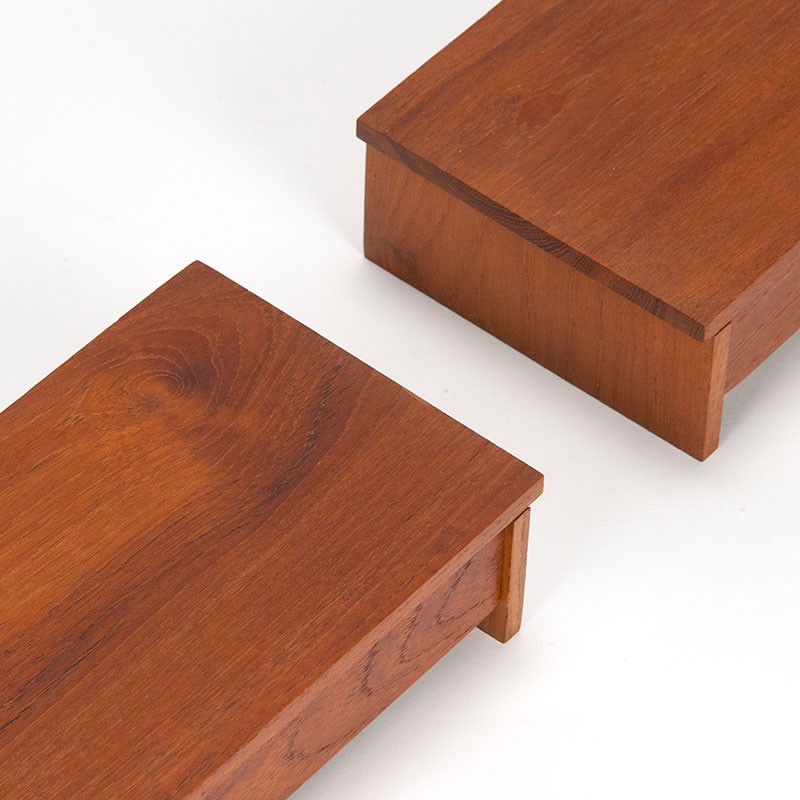 Set of 2 floating wall drawers/bed side table. Mid-Century Danish set from the late 1950s, early 1960s. Beautifully designed in teak wood. The condition is good, with no rings or scratches. The dimensions are 35 cm long, 17 cm deep, and 8 cm high.