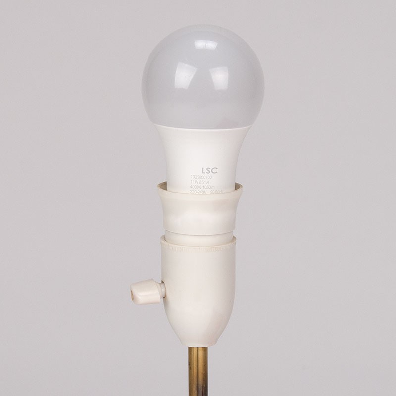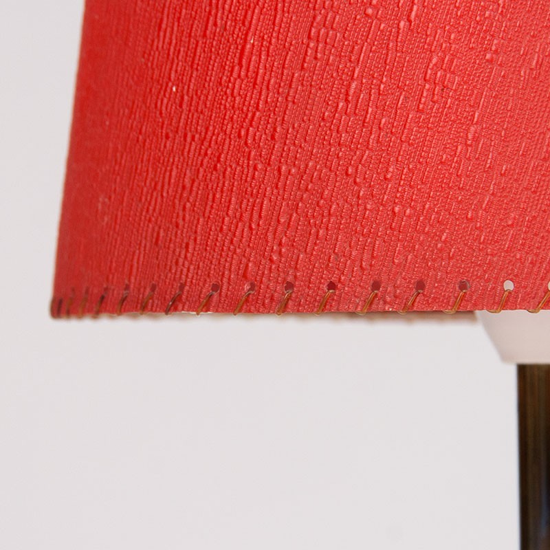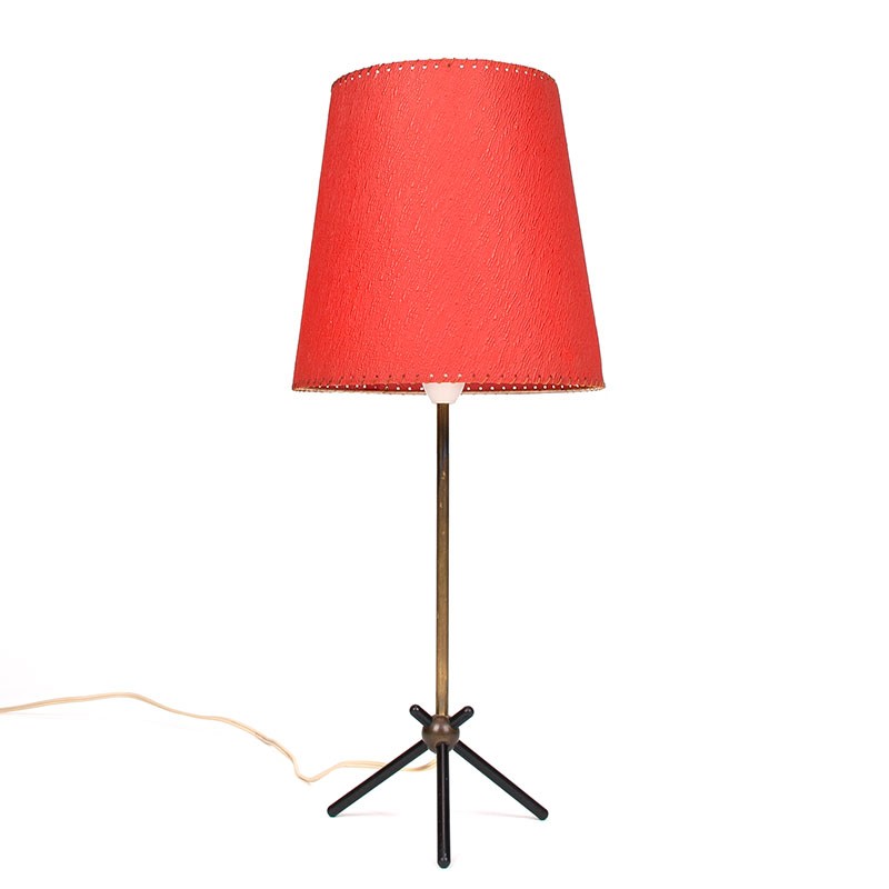 Vintage table lamp from the late fifties, early sixties. Special table lamp on metal tripod. The red cap is clamped onto the light bulb. Switch and socket in one (typical Danish). The condition is good, wiring has been checked, see details. The dimensions are 56.5 cm high and 24 cm in diameter.