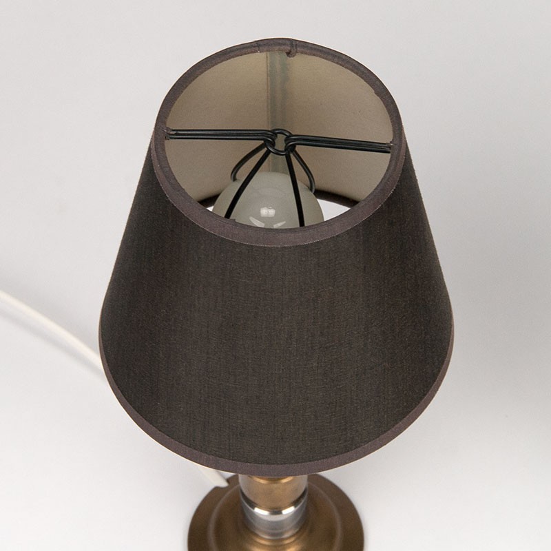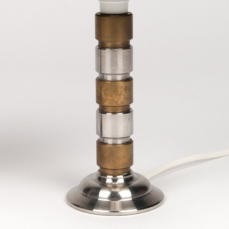 Mid-Century design table lamps. Special vintage set with opposite base in brass and metal. The caps clamp on the light bulb. The condition is good, wiring replaced, see details. The dimensions are 29 cm high and 14 cm in diameter. The base is 15 cm high (measured to the fitting) and 8 cm in diameter.