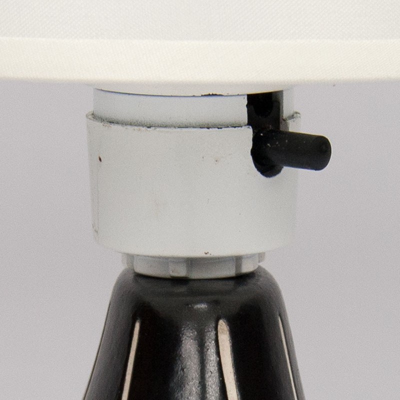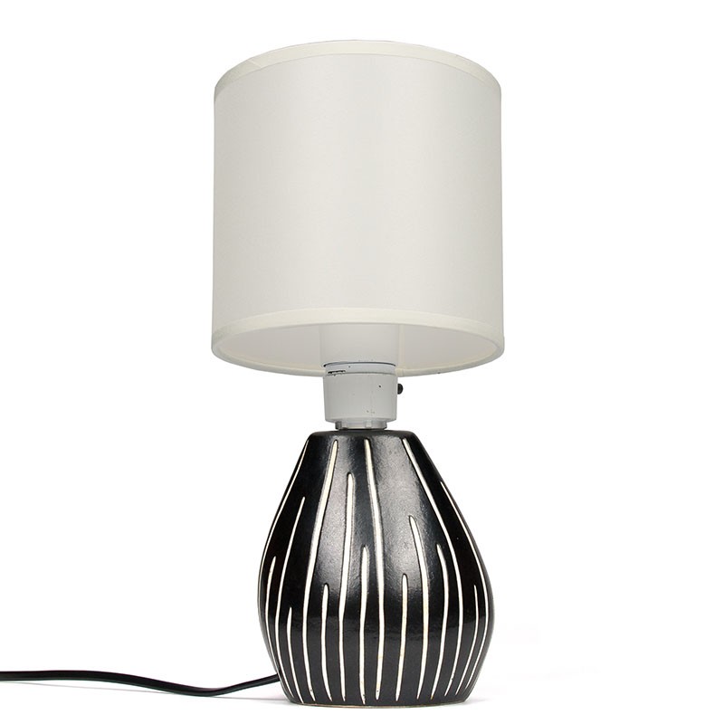 A small, Mid-Century table lamp from the late 1950s. Made and designed by Elisabeth Loholt, model number 27, in black and white ceramic. It is in good condition, undamaged, and rewired (see details). The lamp measures 30 cm high, including the shade; the base is 13 cm high, excluding the socket, and 11 by 8 cm.