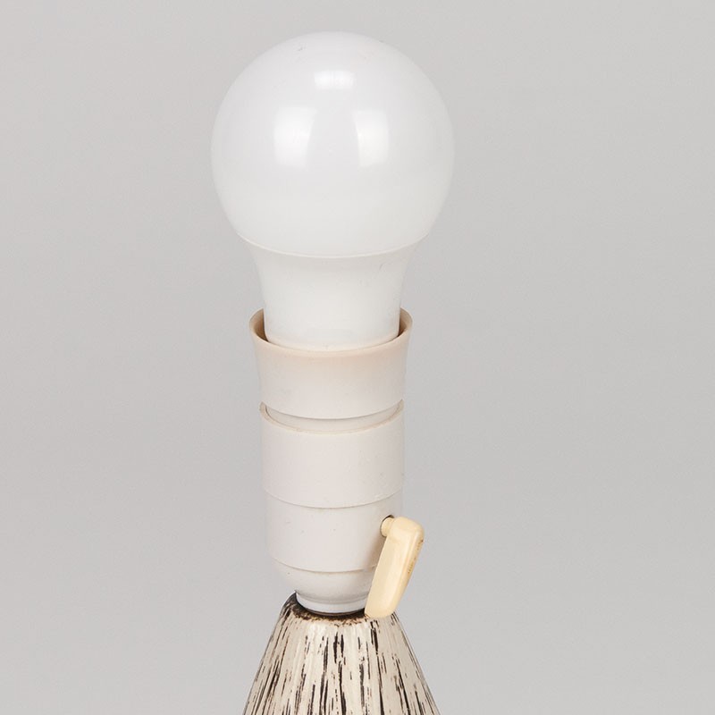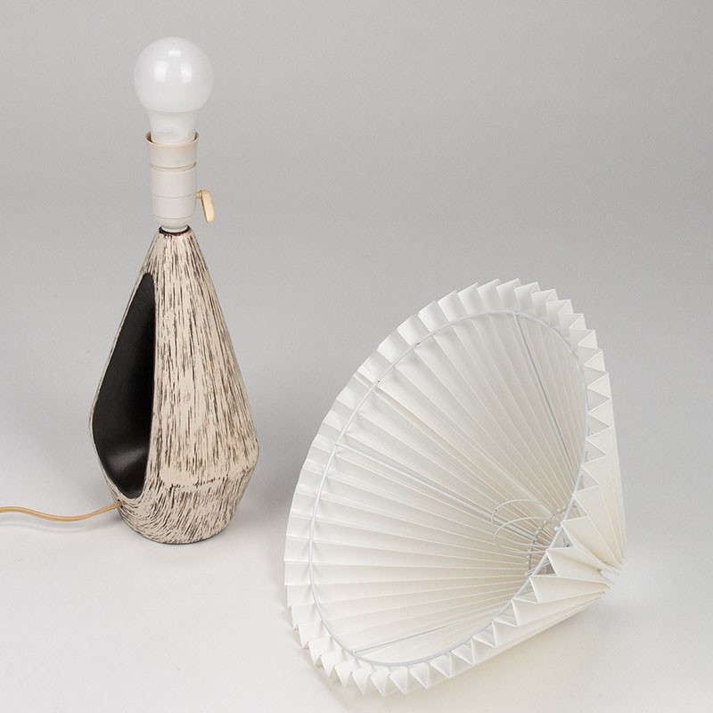 Table lamp from the Danish ceramic brand Søholm. Beautiful vintage table lamp with a uniquely designed base. The lamp is marked on the bottom. The shade clamps onto the light source. It is in good, undamaged condition; see details. The dimensions are 47 cm high and 33 cm in diameter; the base, measured without the socket, is 26.5 cm high, 15 cm wide, and 10.5 cm deep.