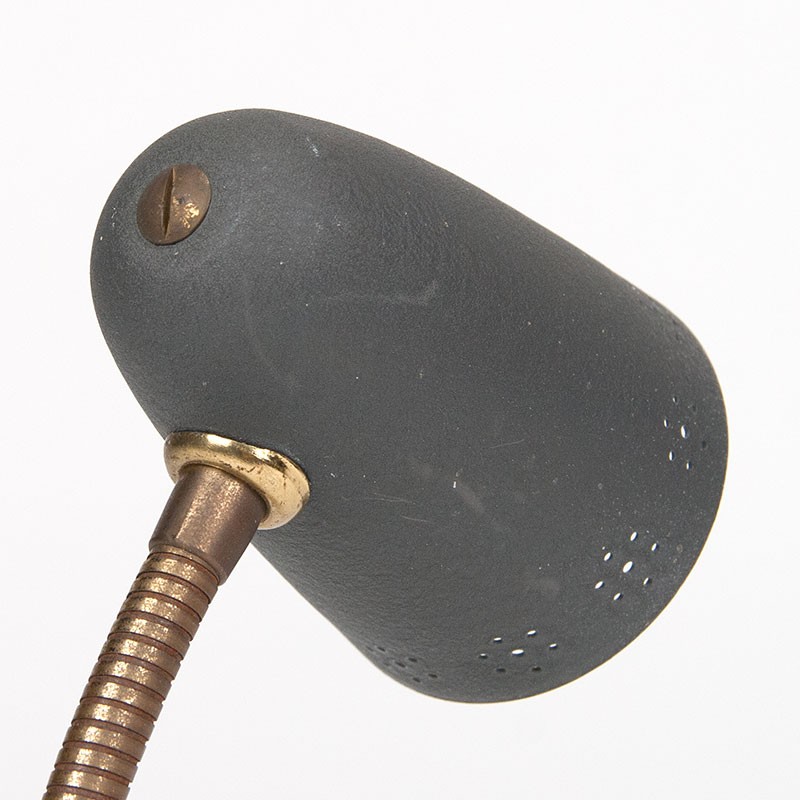 Small table lamp from the period 1955-1965. Beautiful design with a flexible arm and an anthracite gray shade with a perforated edge. The base is made of powder-coated metal. It is in good condition; the wiring has been replaced. It measures 26.5 cm high, the shade is 10 cm long, and 7 cm in diameter.