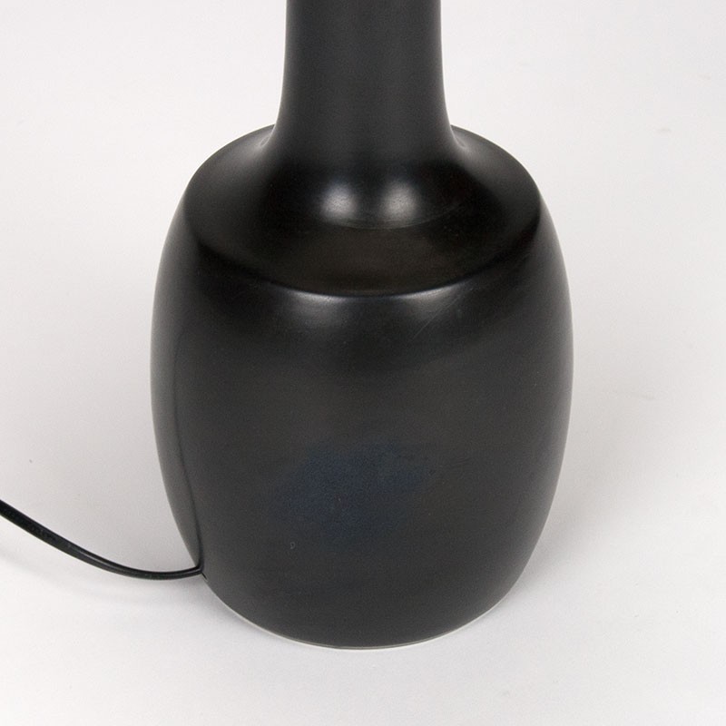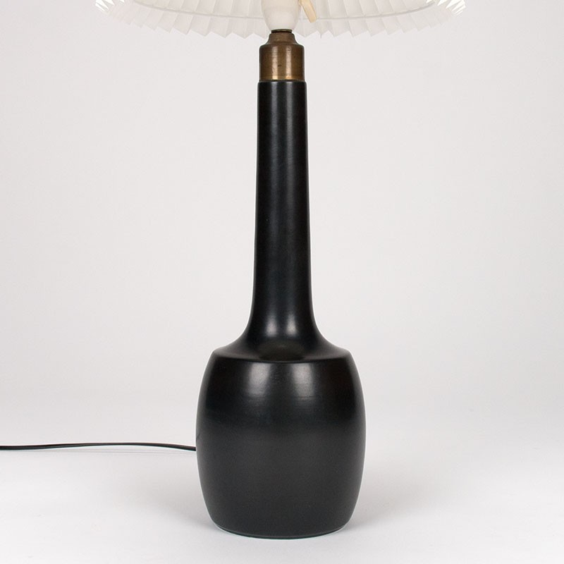 Danish designer table lamp, made of ceramic. The Mid-Century table lamp is a design by Esben Klint and produced by Le Klint/Palshus. Number 945. It has a beautiful matte black base with brass detailing and a pleated clamp shade. The condition is good; the wiring has been replaced, and the base is undamaged. The total dimensions are 33 cm in diameter and 64 cm high; the base itself is 45 cm high, measured to the socket.