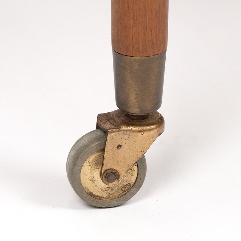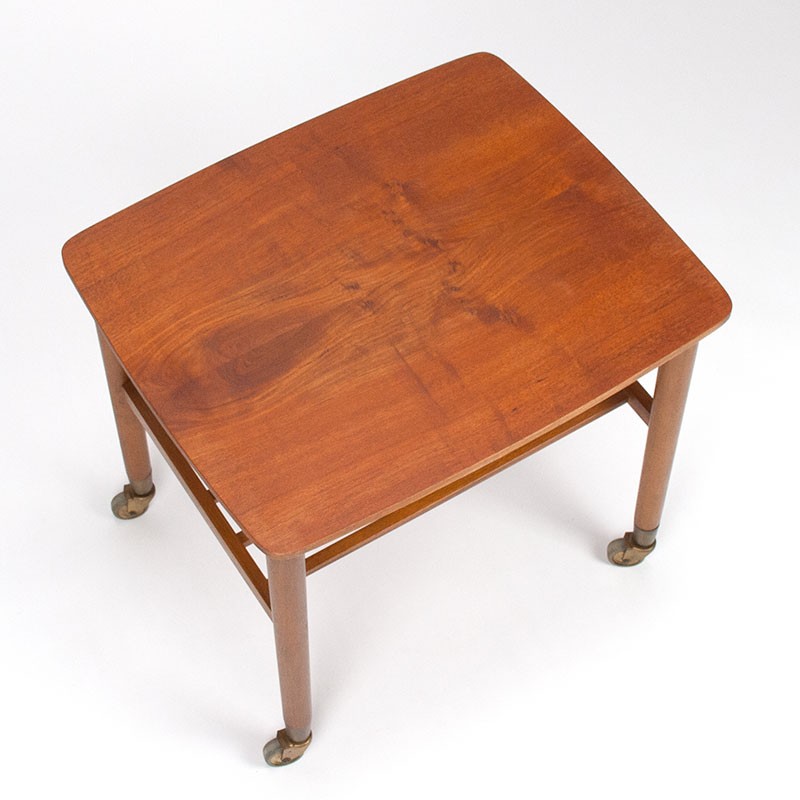 Danish vintage side table with a teak top and a beech frame. It stands on small casters with brass details. The top has a clear wood grain (no stains). It is in good condition, see details. The dimensions are 59.8 cm wide, 49.8 cm deep, and 45.5 cm high.