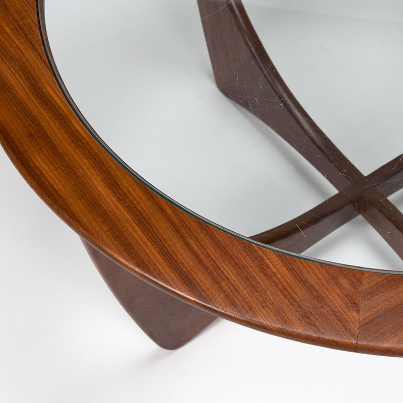 English designer coffee table designed by Victor Wilkins for Gplan. This vintage coffee table, model Astro, has a beautiful, open, organic design in teak and a glass top. Its condition is good considering its age; the glass has some scratches. It measures 84 cm in diameter and 45.5 cm high.