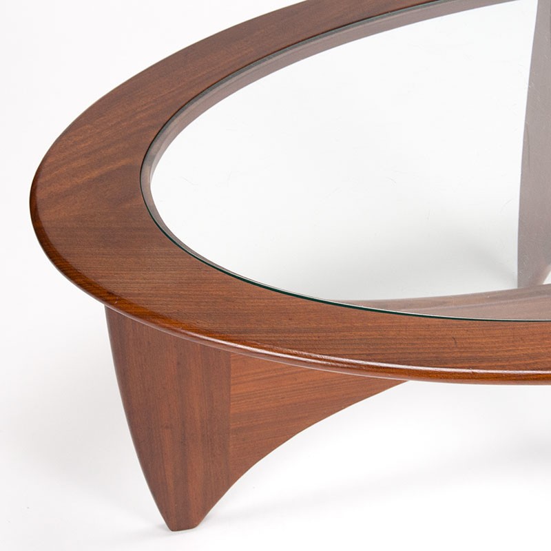 Oval G-plan coffee table, Astro model, from the 1960s. This vintage coffee table was designed by Victor Wilkins. The table has a beautiful open design in teak with a glass top. It is in good condition, with minimal signs of wear on the base. Theglass top does have a few scratches, see details. The dimensions are 122.5 cm long, 66 cm wide, and 41.5 cm high.