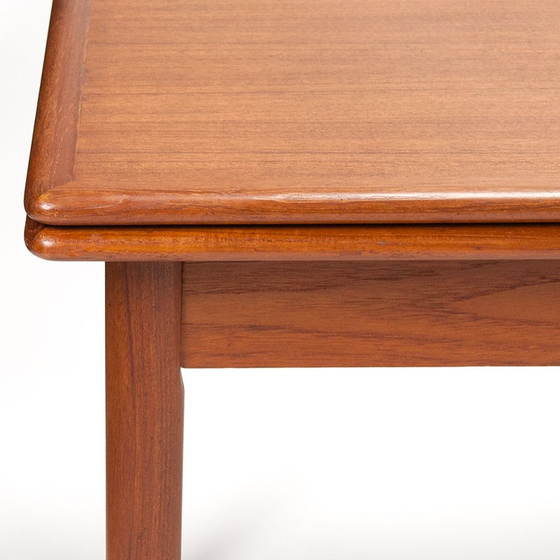 Extendable teak dining table. Vintage model from the mid-1960s, Denmark. Beautiful design with rounded corners. The condition is good, no rings, see details. The dimensions are 126.5 cm long (extendable by two 47.5 cm extensions to 221.5 cm), 86 cm wide, and 74 cm high.