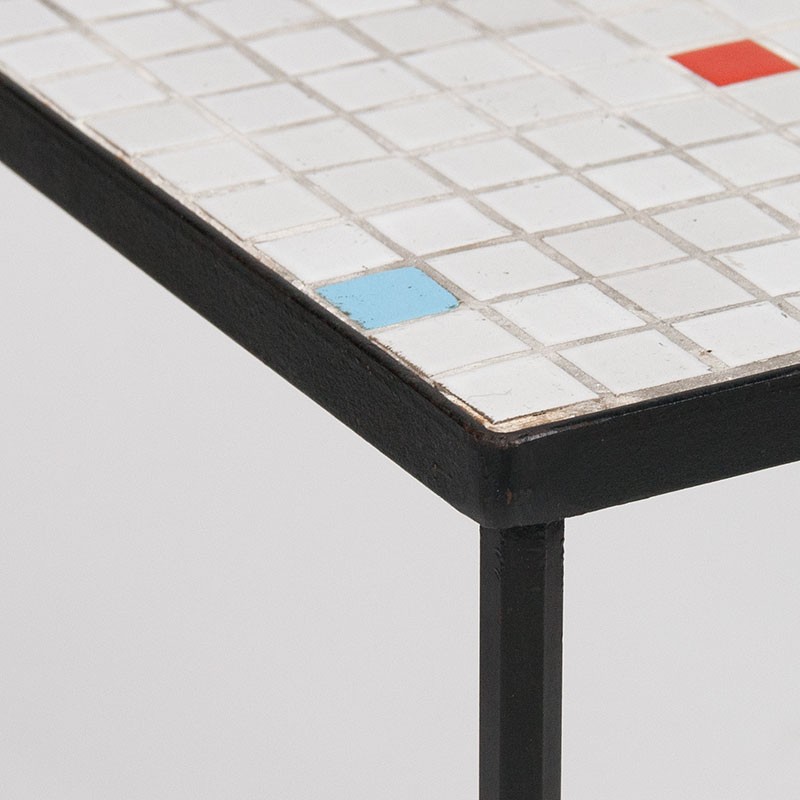 Plant table and/or side table from the late 1950s. Beautiful vintage mid-century piece with a black metal base and a mosaic top. The condition is good considering its age (no chips), see details. The dimensions are 31 cm by 31 cm and 39.5 cm high.