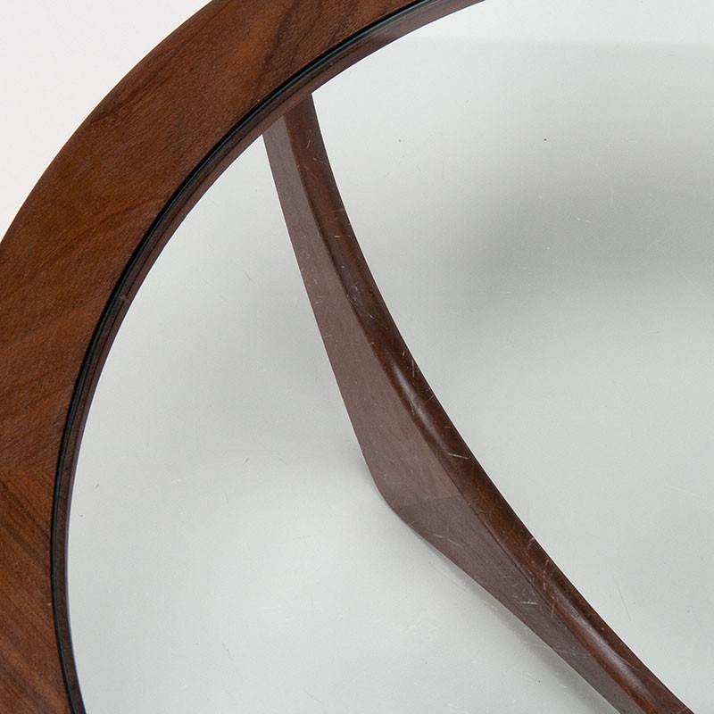 Designer coffee table designed by Victor Wilkins for Gplan. This vintage coffee table, model Astro, has a beautiful, open, organic design in teak and a glass top. The condition is good considering its age; the glass has some small scratches. It measures 84 cm in diameter and 45.5 cm high.