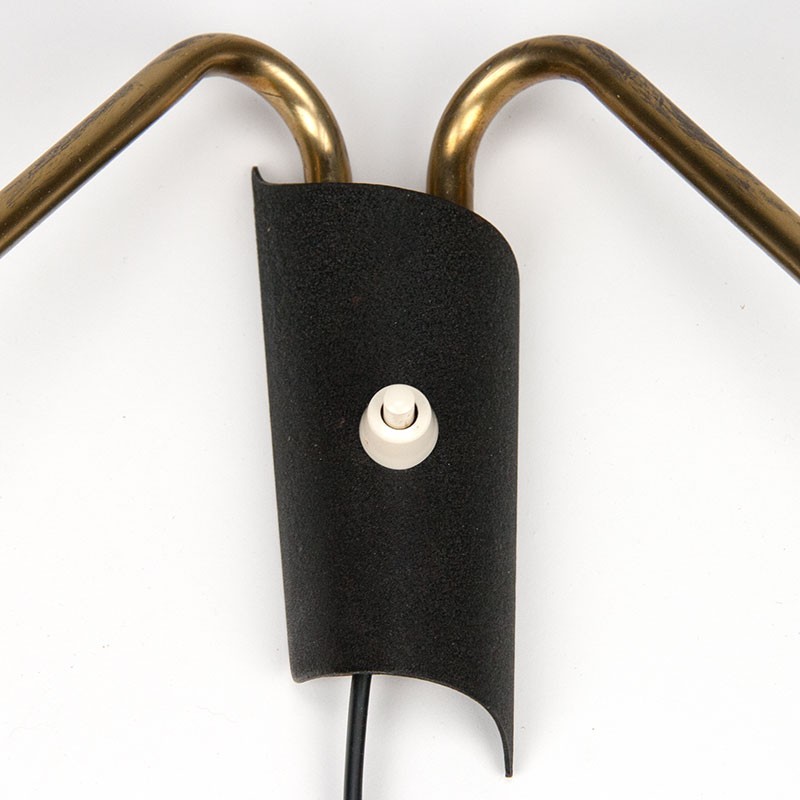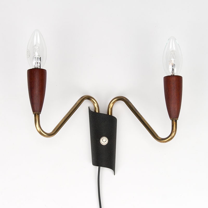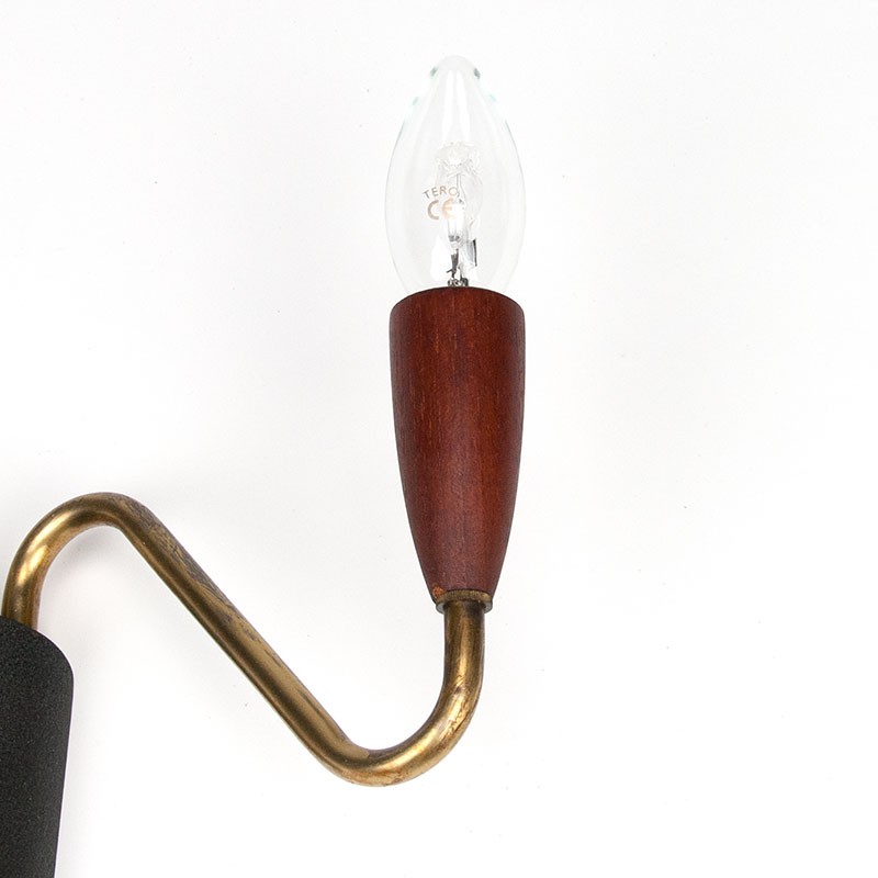 Double model wall lamp from the fifties. The vintage model has a black powder coated metal wall part, brass arms with teak end. The condition is good, wiring replaced, see details. The dimensions are 27 cm wide, 9.5 cm deep and 17.5 cm high.