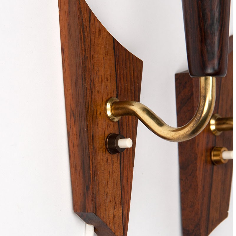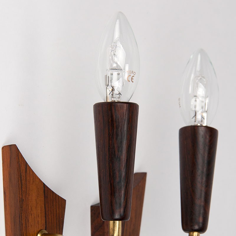 Mid-Century set of wall lamps from Denmark. Beautiful set, made of rosewood, marked Laoni-Belysning. The condition is good, wiring has been replaced, see details. The dimensions are 18.5 cm high, 6 cm wide and 11 cm deep.