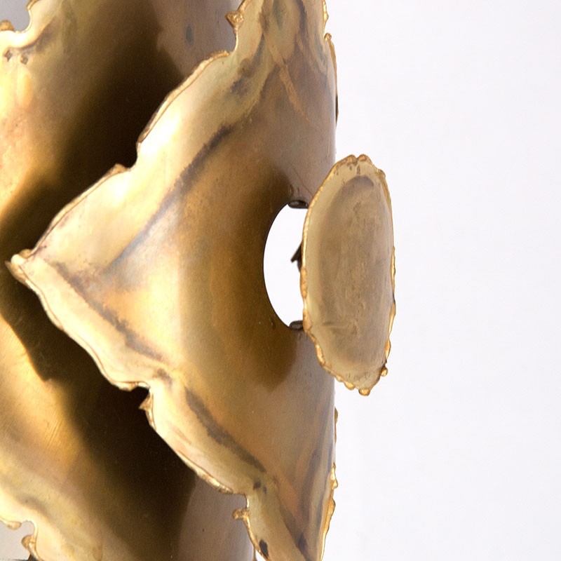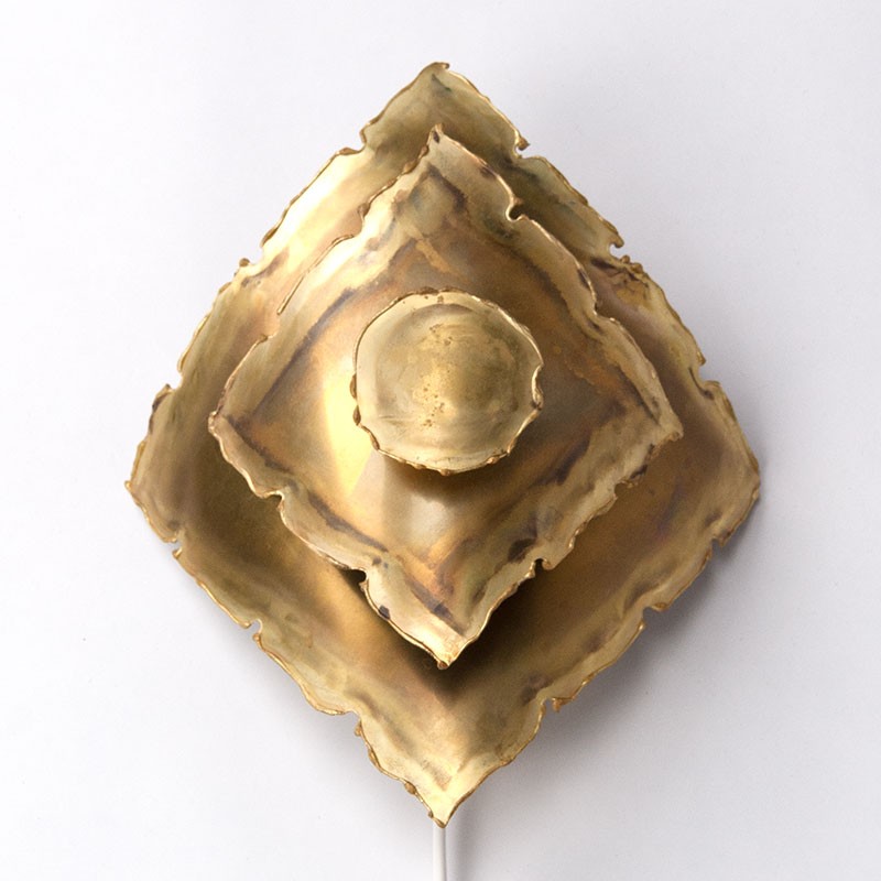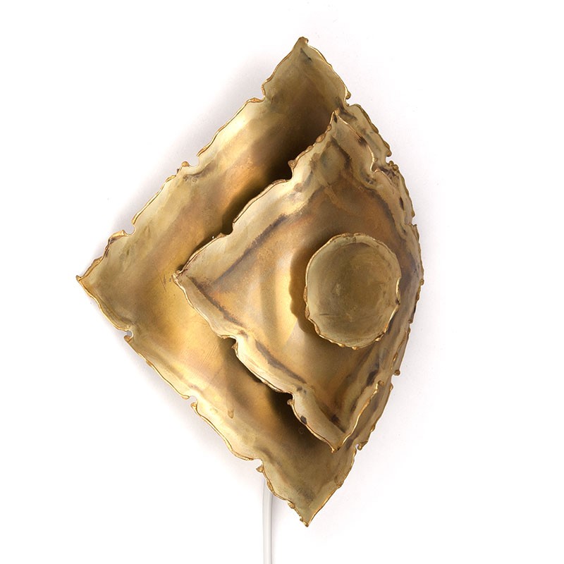 Design wall lamp designed in the sixties by Svend Aage Holm Sørensen. Wall lamp, vintage piece, with a brutalist design made of brass. The condition is good, the wiring has been checked, see the details. The dimensions are 23 cm high, 18.5 cm wide and 10 cm deep.