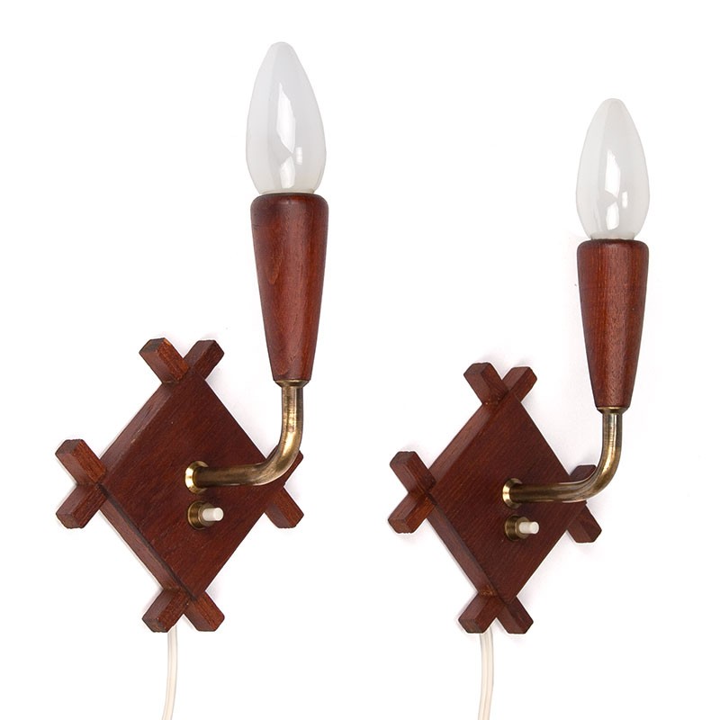 Set of 2 wall lamps from the period 1955-1965, Denmark. Special wall part in teak. The condition is good, wiring checked. The dimensions are 13 cm wide, 10 cm deep and 19 cm high.