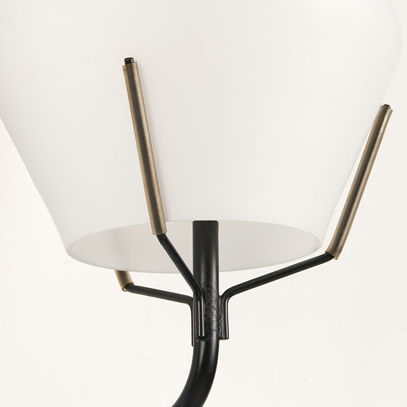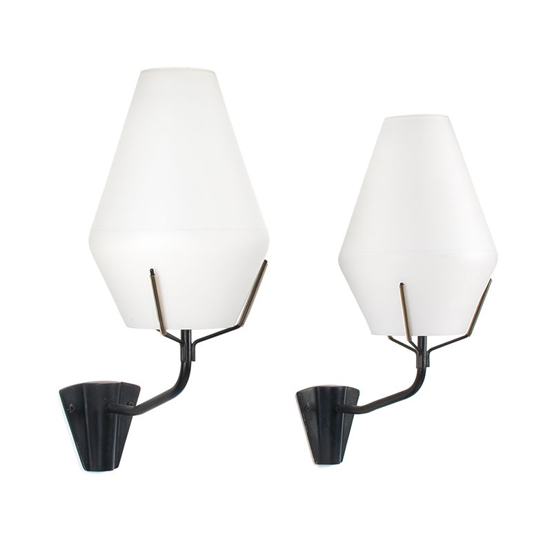 Rare set of 2 large wall lamps from the Swedish brand ASEA from the fifties. The vintage Mid-Century design wall lamps have a black metal fixture and large white opaline glass cup. Both lamps are marked. The condition is good, glass is undamaged, metal only minor signs of use, see details. The dimensions are 20 cm in diameter, 31 cm deep and 50 cm high.