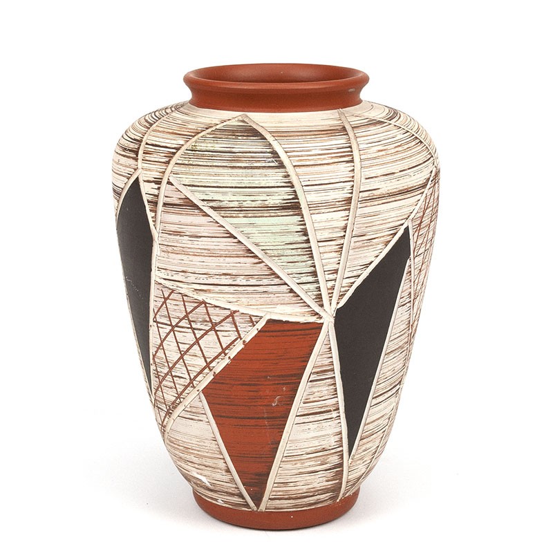 Abstract gedecoreerde vaas van keramiek, model Marina. Gemaakt eind vijftiger, begin zestiger jaren in de Eiwa keramik fabriek, Duitsland. De conditie is goed, onbeschadigd, zie details. De afmetingen zijn 20 cm hoog en 13,5 cm in diameter.