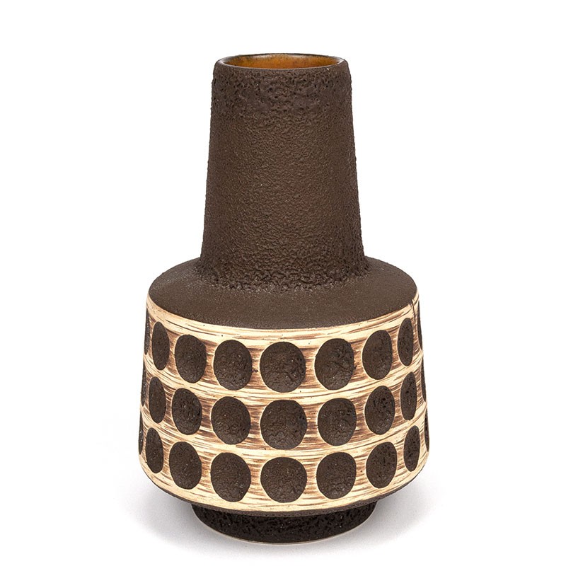 Bruine vaas van keramiek. Uitgevoerd met een decor van stippen. Afkomstig uit een van de vele West Duitse keramiek fabrieken. De conditie is goed, onbeschadigd, zie details. De afmetingen zijn 17 cm hoog en 11 cm in diameter.