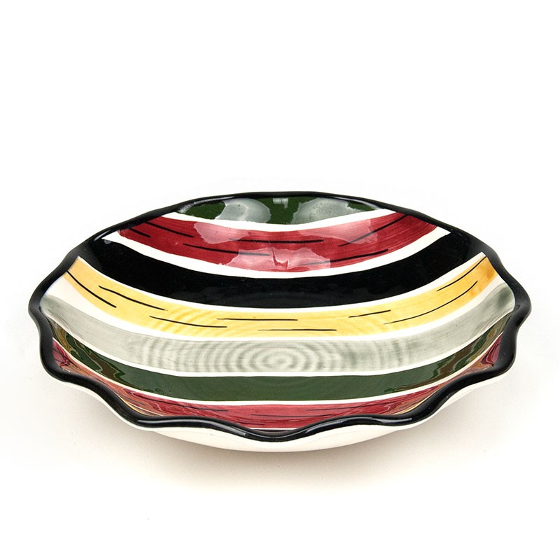 Schaal van keramiek uit de Strehla keramiek fabriek. De vintage schaal heeft een mooi jaren vijftig decor en is aan de onderzijde gemerkt. De afmetingen zijn 24,3 cm in diameter en 4,5 cm hoog.