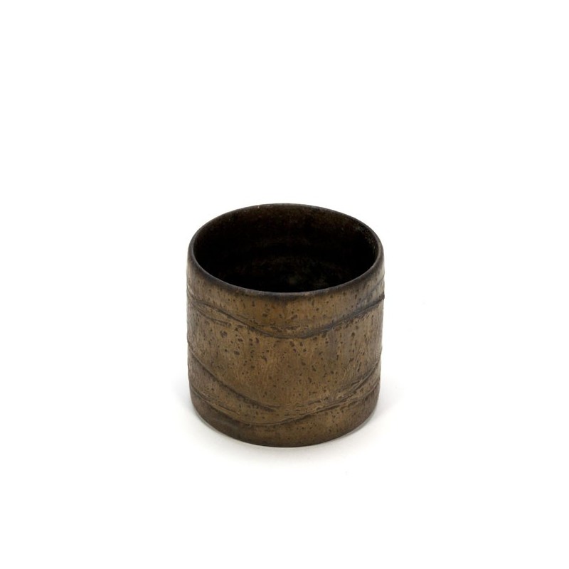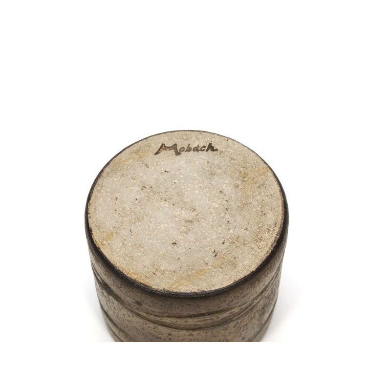 Vintage bloempot gemaakt in de Utrechtse aardewerkfabriek Mobach. Prachtig exemplaar in bijzondere kleur. De conditie is goed, onbeschadigd, wel iets kalkaanslag aan de binnenzijde. De afmetingen zijn 9,5 cm in diameter en 8,5 cm in hoogte.