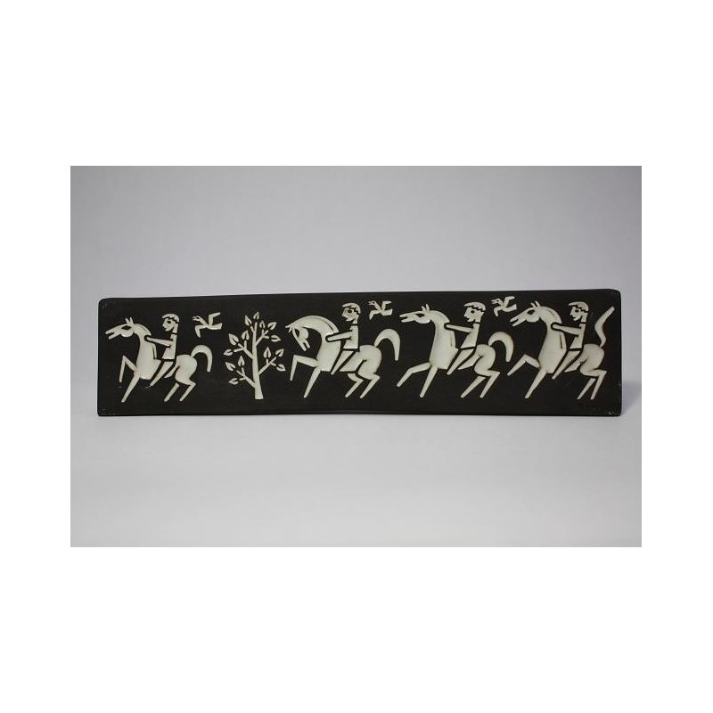 Mooie wandtegel van het Nederlandse keramiek merk Ravelli. De tegel is ontworpen door Jaap Ravelli en heeft als afbeelding ruiters. De tegel verkeert in een perfecte staat. De afmeting is 37,5 cm breed en 9 cm hoog.