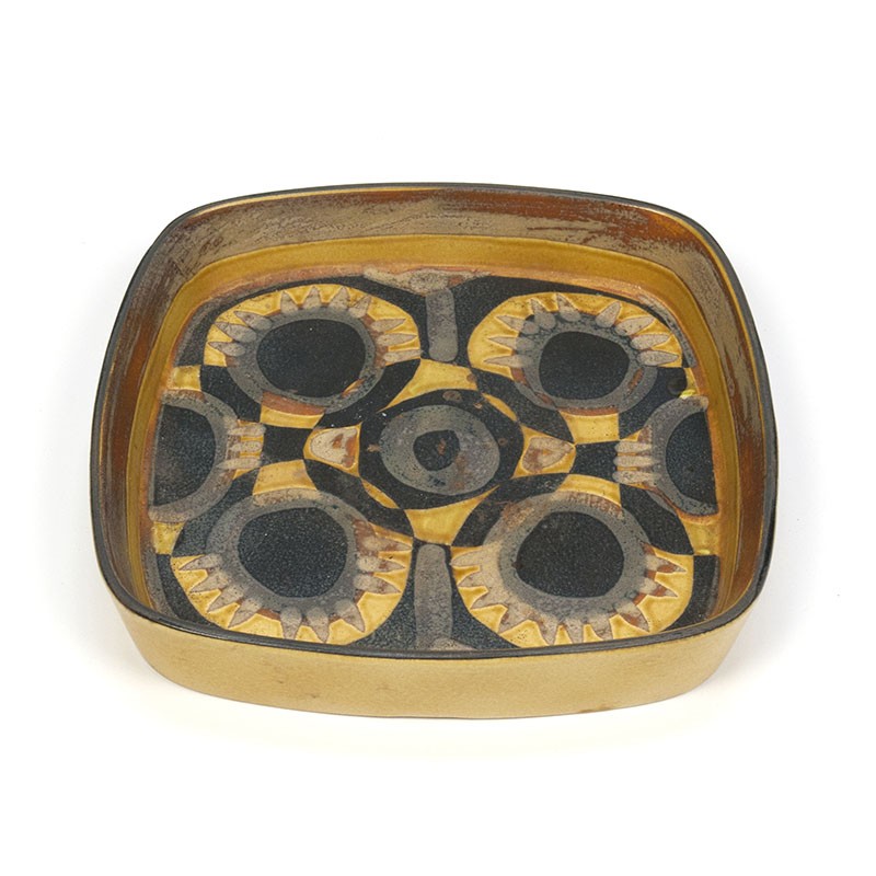 Deense vintage design schaal van aardewerk. De schaal is ontworpen door Johanne Gerber voor de Baca serie van Royal Copenhagen. De schaal is gemerkt aan de onderzijde met nummer 790/2884. De conditie is goed, onbeschadigd, zie de details. De afmetingen zijn 22,5 cm breed en 4 cm hoog.