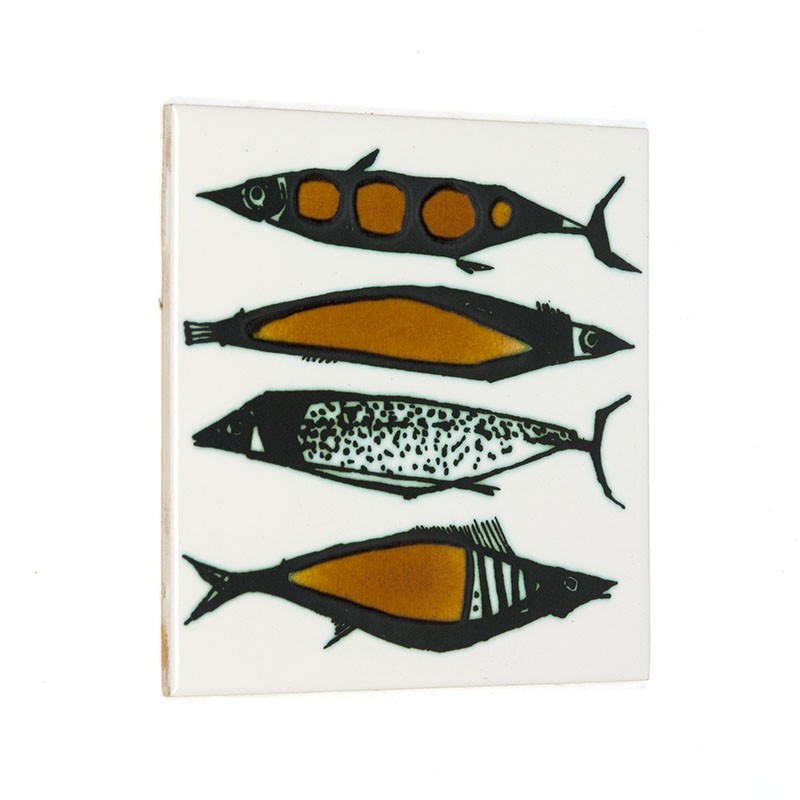 Tegel uit de zestiger/ zeventiger jaren, afkomstig uit Engeland. Vintage exemplaar met decoratieve afbeelding van 4 vissen. De conditie ia goed, wel is de tegel gebruikt wat zichtbaar is op de achterzijde. De afmeting is 15,5 bij 15,5 cm.