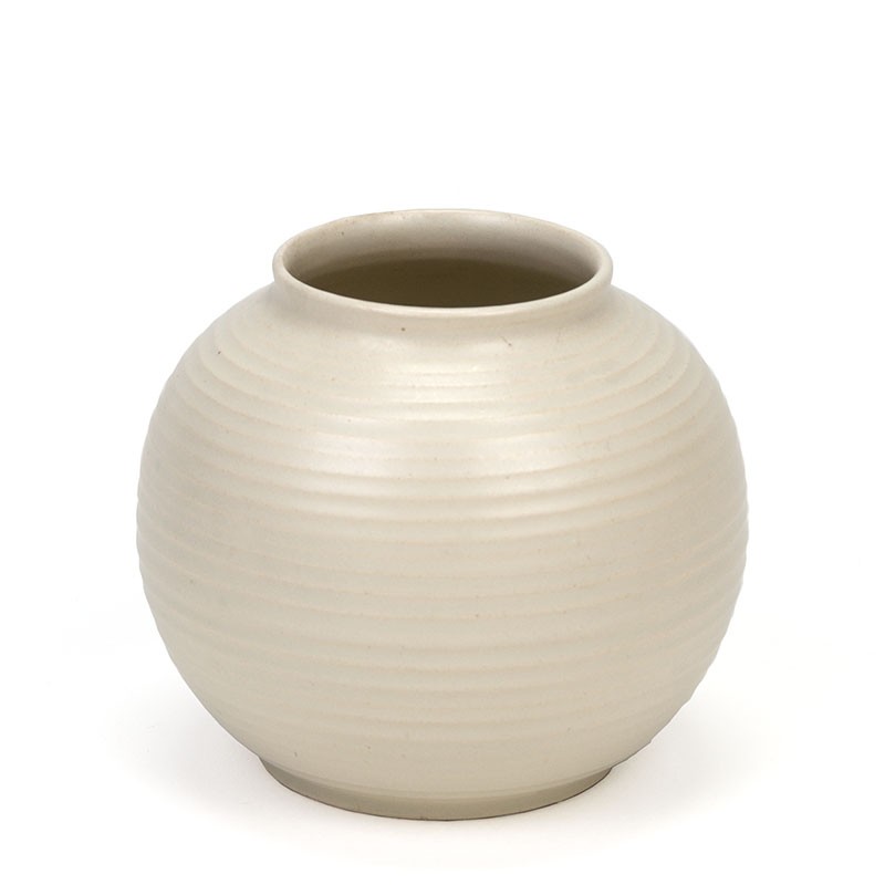 Nederlandse vaas uit de dertiger jaren. Mooi klein model, gemerkt, in wit geribbelde uitvoering. De conditie is goed, geen snips, zie details. De afmetingen zijn 10,5 cm in diameter en 10 cm hoog.