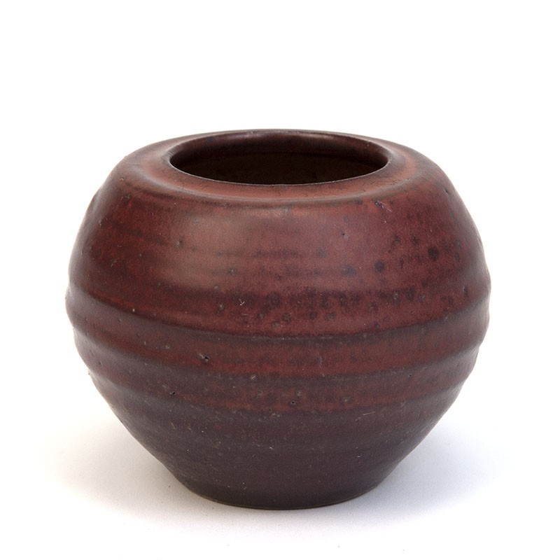 Klein model aardewerken vaasje van Mobach Utrecht. Mooie tint bordeaux. De conditie is goed, onbeschadigd, zie details. De afmetingen zijn 8 cm hoog en 9,5 cm in diameter.