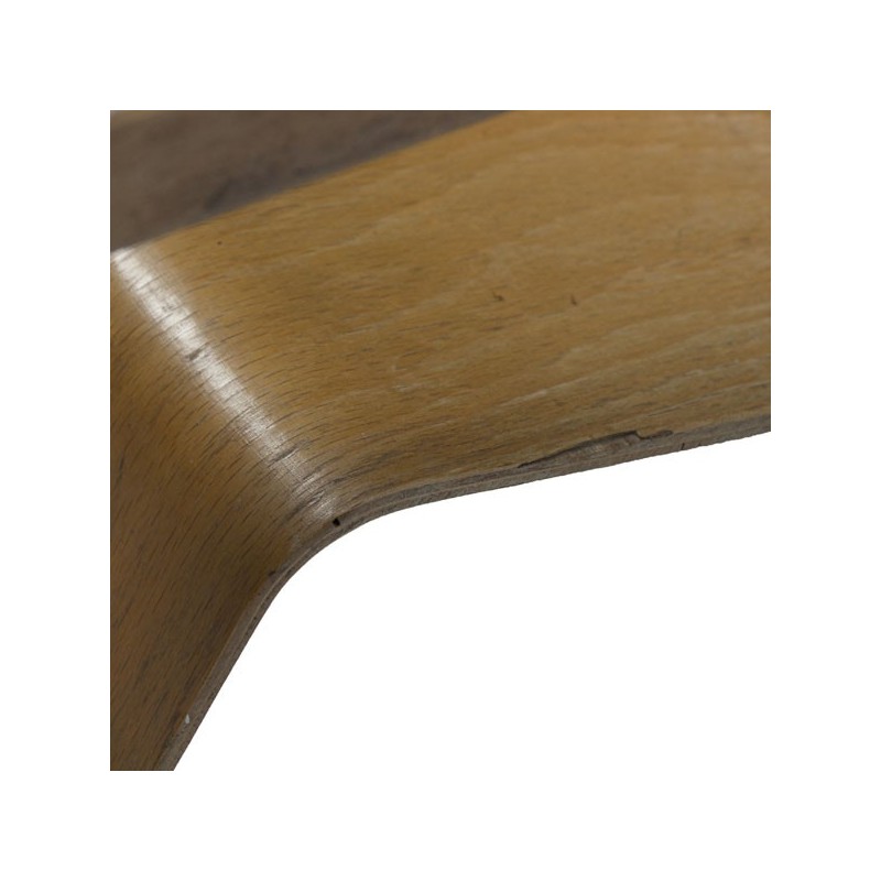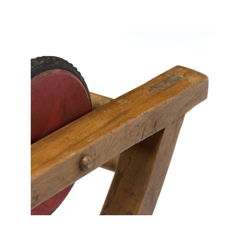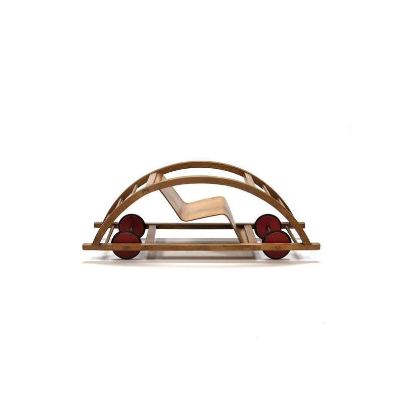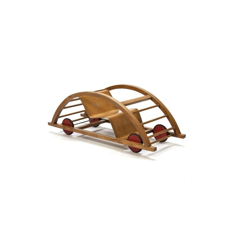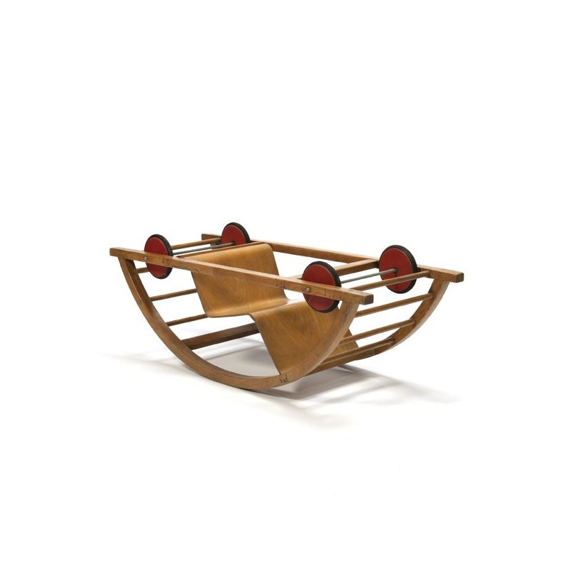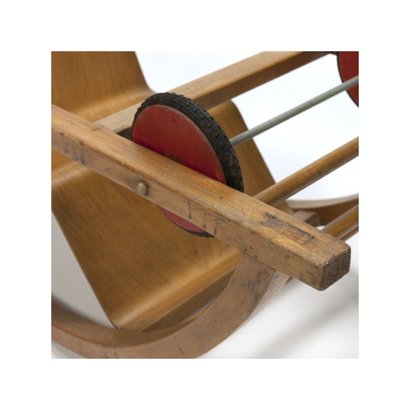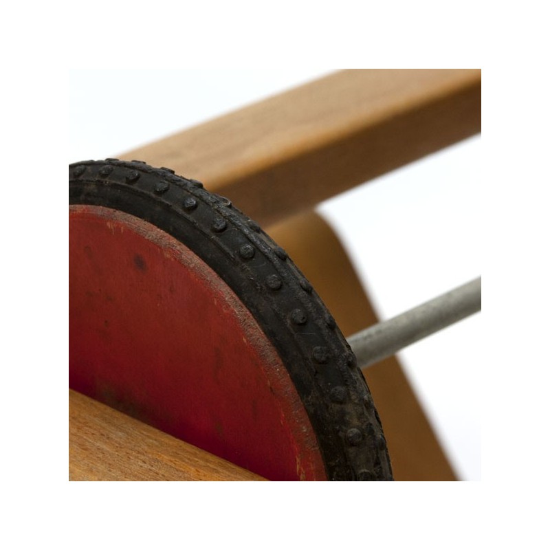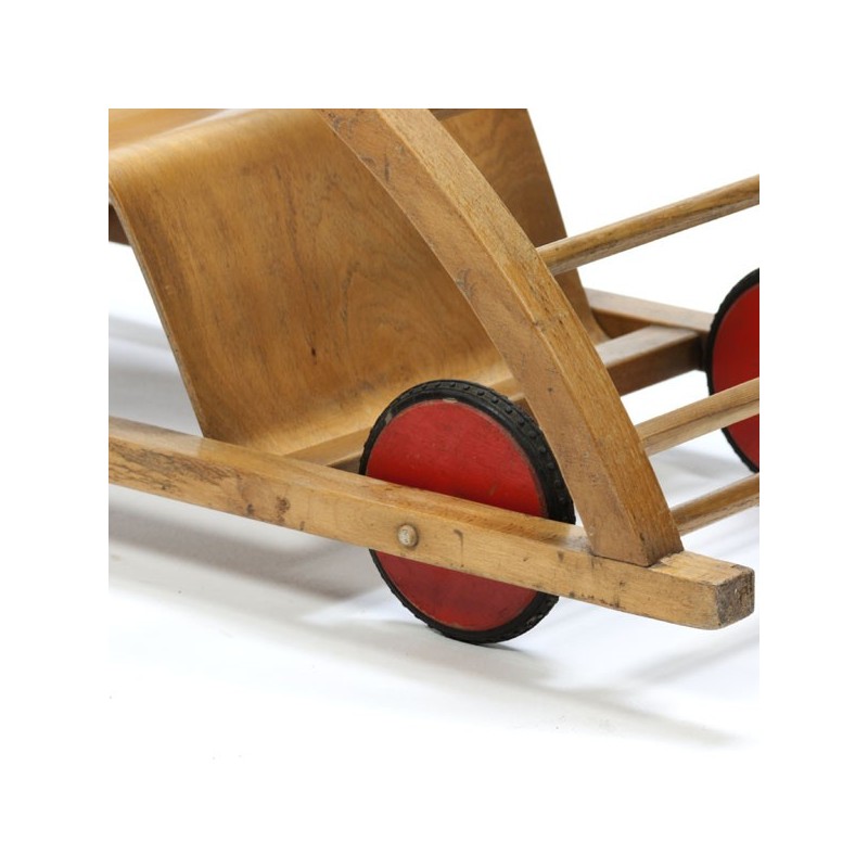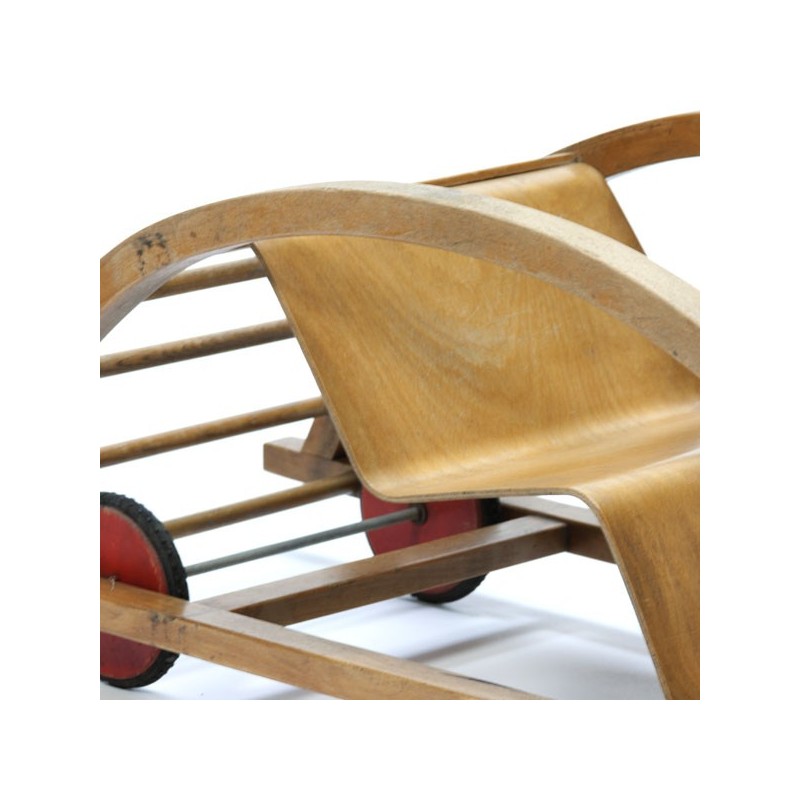 Vintage kinderwagentje/ hobbelpaard met plywood zitting, ontworpen door Hans Brockhage, onder supervisie van Bauhaus meester Mart Stam, in 1950. Het gaat om een eerste editie met rode wieltjes. De conditie is goed gezien de leeftijd, er zijn gebruikssporen zichtbaar, zie voor details de foto's. De afmeting is 100 cm l/ 38,5 cm B/ 37,5 cm H.