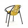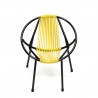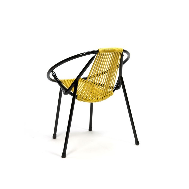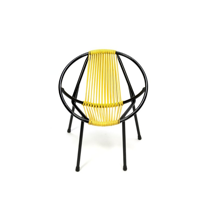 Vintage design kinderstoeltje van het Nederlandse merk Rohé, ook wel "Spagetti stoel" genoemd. Mooi ontwerp, rond gevormd zwart frame en zitting en rugleuning van geel draad. De conditie is goed gezien de leeftijd, lichte gebruikssporen zichtbaar, zie ook de detailfoto's. De afmeting is 45 cm in diameter, 33 cm zithoogte en 53 cm hoog.
