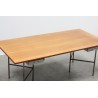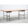Grote tafel-/ bureau met houten blad en metalen onderstel. De tafel is zowel te gebruiken als eettafel en als bureau. Onder het blad zitten twee lades ( licht grijs)die naar beide zijden open kunnen. Het houten blad verkeert in een nette staat. Het onderstel is onbehandelt metaal en heeft sporen van roest, dit geeft de tafel extra uitstraling. De afmeting is 200 cm L/ 100 cm B/ 77,5 cm H.
