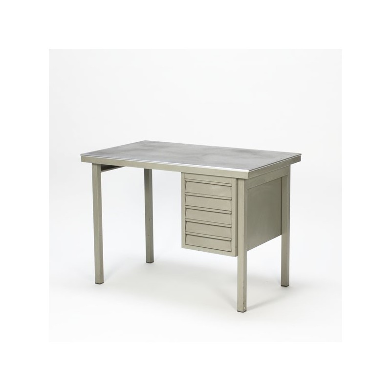 Industrieel bureau uit de zestiger jaren. Het bureau heeft een linomium blad in de kleur zwart, de staat van het blad is gebruikt, ( butsen, vlekken etc.) de prijs is hierop aangepast. De afmeting is 100,5 cm L/ 59,5 cm B/ 71,5 cm H.