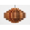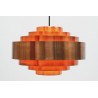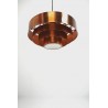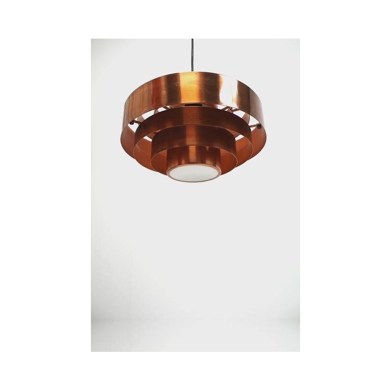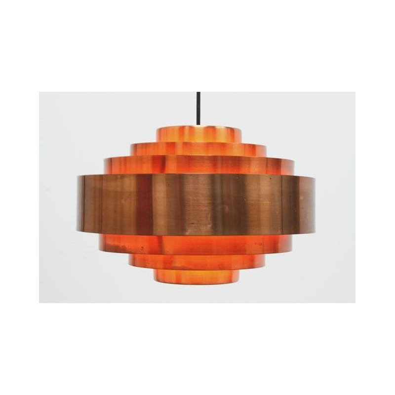 Vintage koper kleurige hanglamp uit Scandinavie. De lamp bestaat uit verschillende ringen, waardoor je niet direkt in de lamp kijkt. De lamp verkeert in een redelijk goede staat, hier en daar is het koper iets verkleurd. De afmeting is 30 cm in doorsnee en 20 cm hoog.