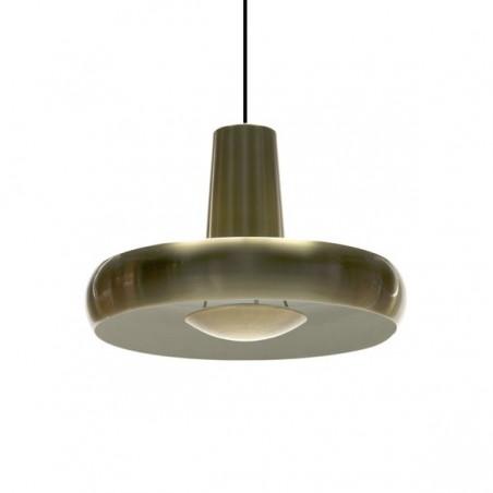 Vintage hanglamp, messing kleurig, uit de zestiger/ zeventiger jaren. De lamp heeft een diffuser in dezelfde kleur als de lamp. De conditie is goed, wel zit er en klein deukje in de rand. De afmeting is 25 cm hoog en 37 cm in diameter.